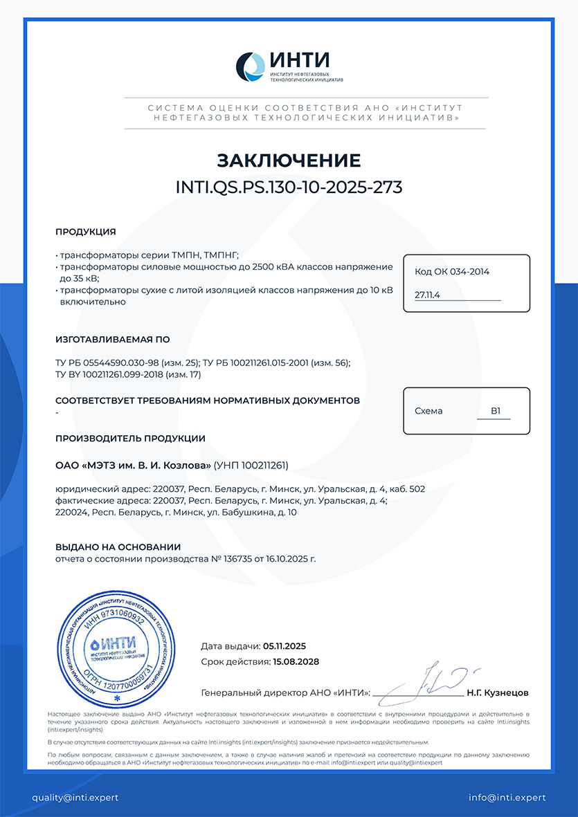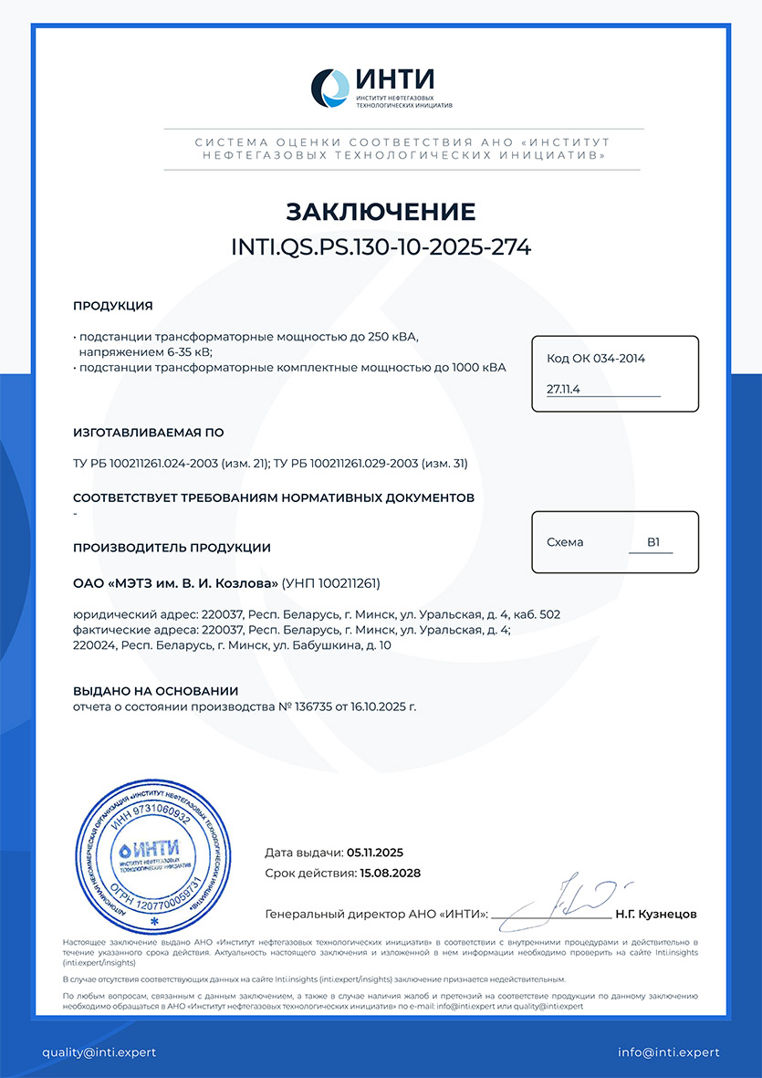 ОАО «МЭТЗ ИМ.В.И.КОЗЛОВА» одним из первых прошел аттестацию силовых трансформаторов на соответствие техническим требованиям ПАО «Россети», и оборудование рекомендовано к применению на объектах ДЗО ПАО «Россети». Список оборудования, материалов и систем, допущенных к применению на объектах ПАО “Россети”