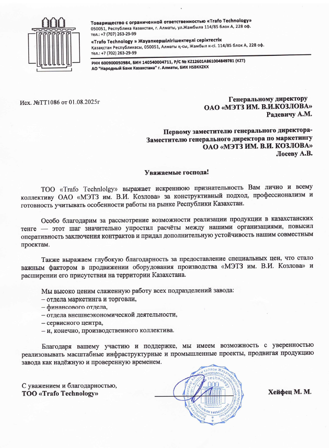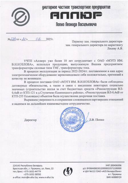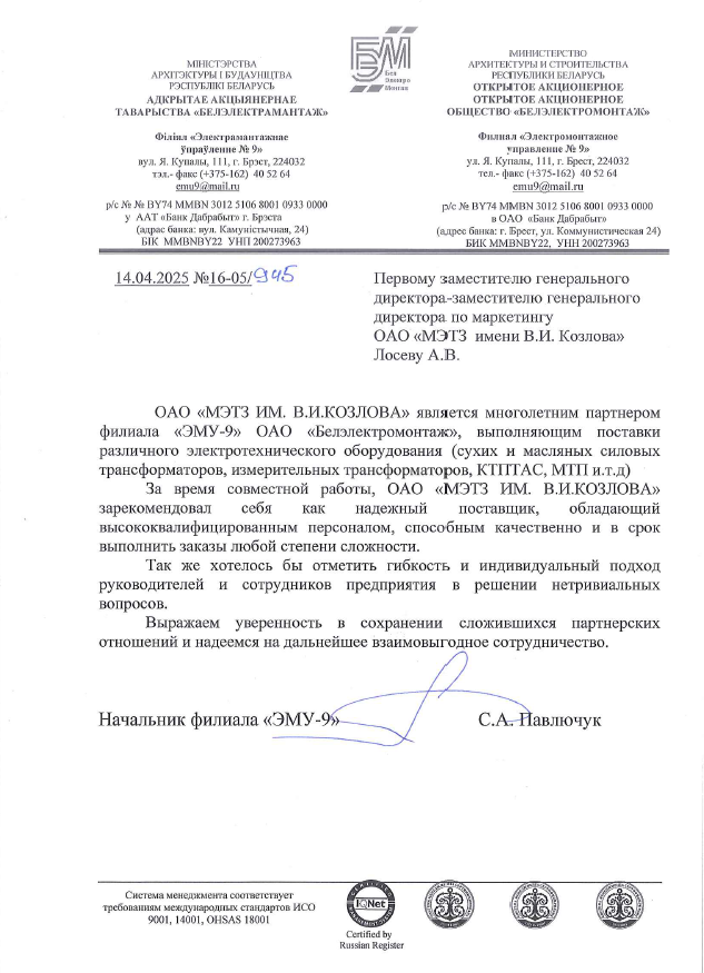 В период сотрудничества по поставкам в наш адрес силовых трансформаторов мощностью от 25 кВА до 1600 кВА напряжением 6, 10 и 27,5 кВ производства ОАО «МЭТЗ ИМ В.И.КОЗЛОВА» - показало себя, как ответственный поставщик, проявивший такие положительные качества, как своевременность, образованность, отзывчивость, что очень важно в настоящее время, в условиях высокой конкуренции как на рынке поставщиков, так и конечных заказчиков.